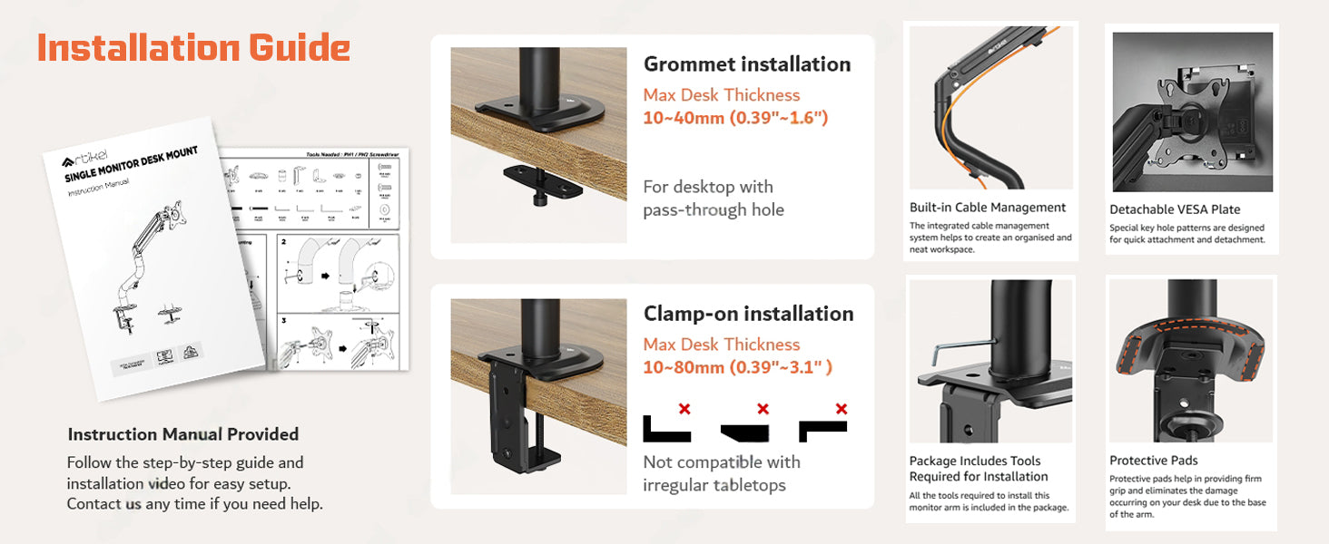 - Free Up Your Desk Space: Artikel Heavy duty monitor arm has an integral cable management feature, helping to hold wires. The single monitor desk mount releases desk space while creating a more comfortable work environment. More desk space, better workflow!