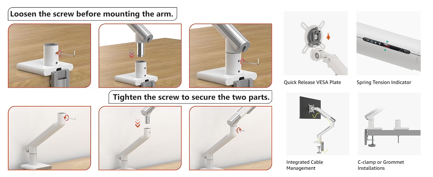 - Easy To Assemble: Monitor mount is easy to install with a C clamp (drill-free) and a grommet mounting option. The quick-release VESA plate makes it simple to attach your monitor. It takes less than 15 minutes from opening the box to using the monitor.