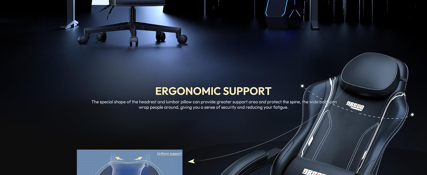 - Premium PU Leather Upholstery: The Drogo Ergonomic Gaming Chair is upholstered in high-quality PU leather, offering supreme comfort and enhanced durability. This material is specifically chosen for its ease of maintenance and resistance to spills, making it ideal for long gaming sessions and frequent use.