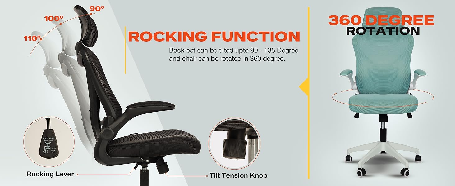 Multiple Adjustment: This ergonomic office chair height can be adjusted according to your needs, allowing you to find the most comfortable sitting position. The maximum tilt of the office chair is 135 degrees. It comes with a 5cm adjustable lumbar support. This home office chair comes with a 90-degree flip armrest which can be used as a convenience and it is a space saver that is easy to be pushed under your desk. and rolling wheels can swivel 360.
