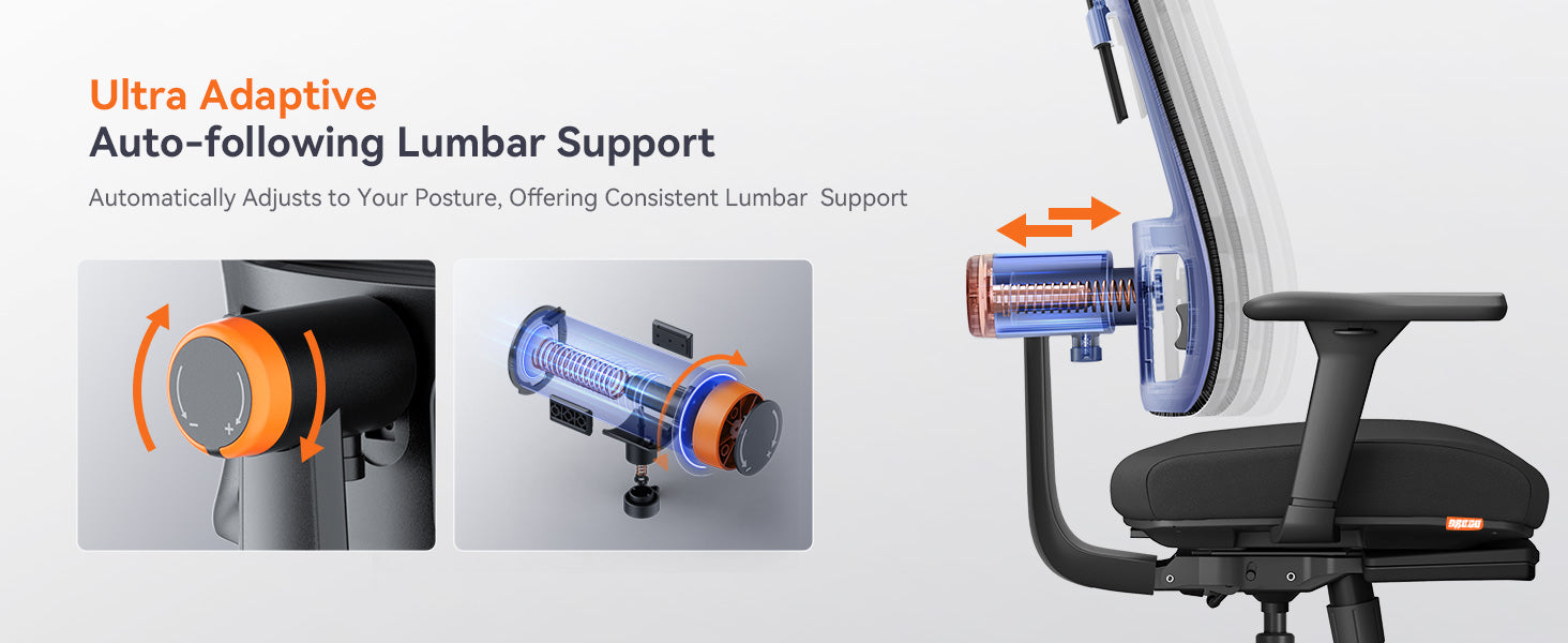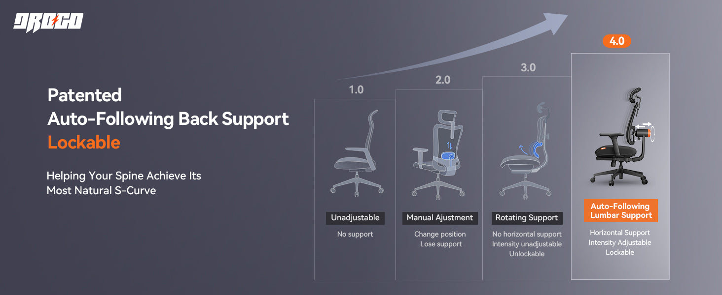 • Unique Adaptive Lumbar Supports: Drogo office chairs use innovative automatic lumbar tracking technology to automatically follow the movement of your lumbar spine, providing a strong support for your lower back throughout the day. Lumbar support strength can be adjusted according to your needs. It fits the natural curvature of your spine and helps relieve back pain caused by sitting for too long.