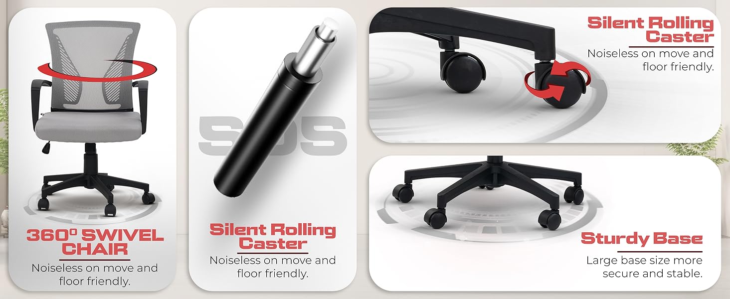 - Sturdy Support and Easy Movement: Equipped with a robust frame that supports up to 120 kg, the chair provides stable and reliable seating. The five-point base with smooth-rolling casters allows for effortless movement around your workspace without scratching the floor, making it versatile for various office environments.