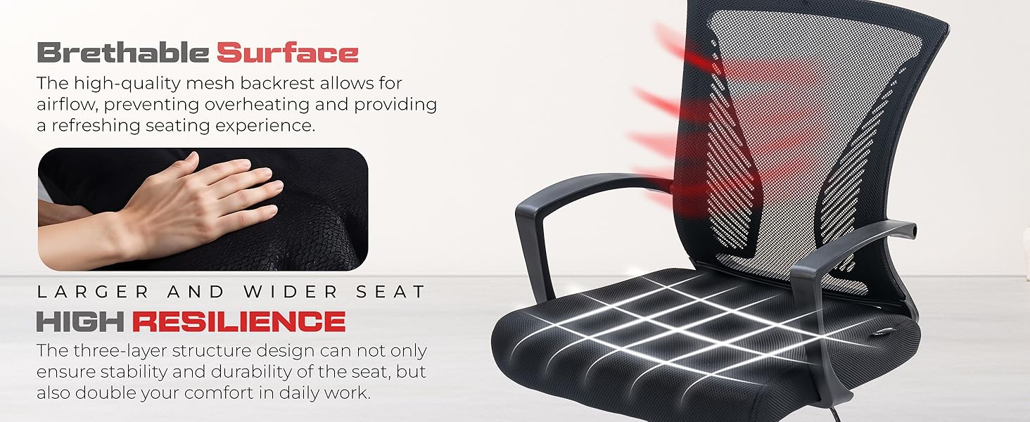 - Premium Breathable Mesh Construction: Crafted with a high-quality breathable mesh, the backrest ensures optimal airflow to keep you cool and comfortable even during long working hours. This mesh design not only promotes ventilation but also enhances the overall durability and aesthetic appeal of the chair.