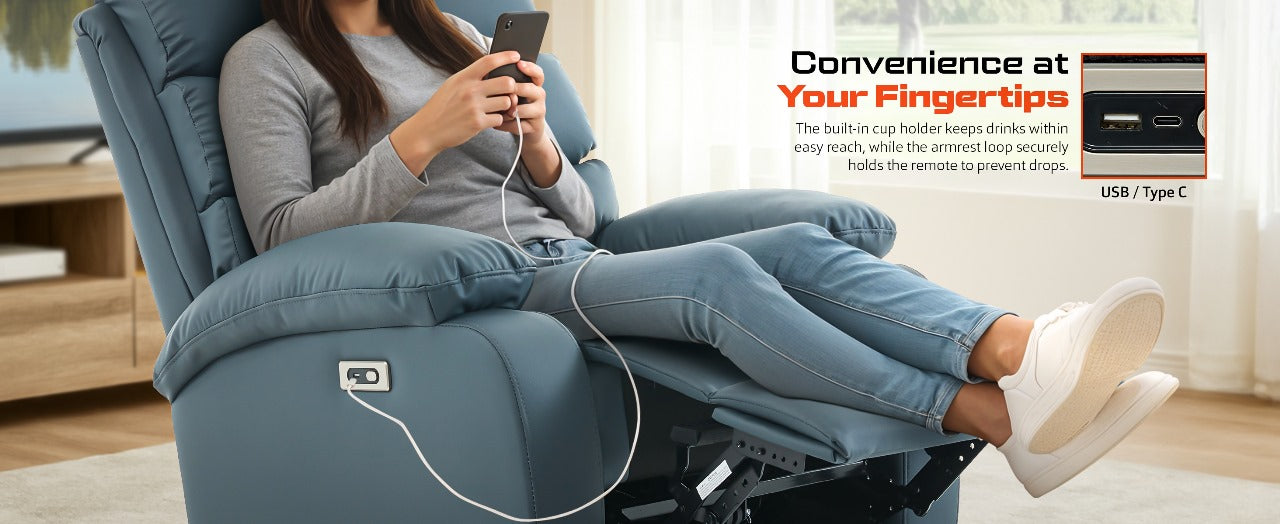 - USB CHARGER PORT FOR CONVENIENT CHARGING – Keep your devices powered while you relax with the built-in USB charger port. A modern feature in your recliner chair, ensuring convenience for all your electronics.