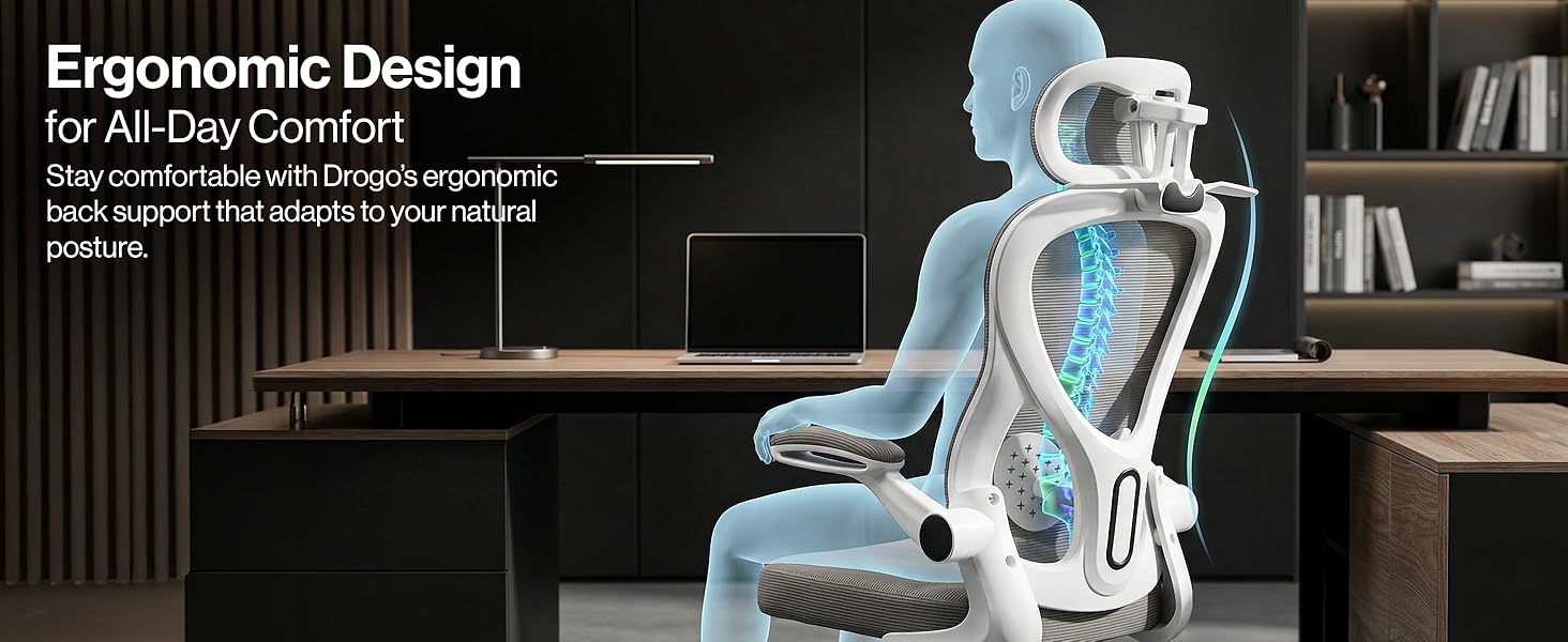 - Height Adjustable Lumbar Support for Lower Back Relief: The Drogo ergonomic office chair includes an adjustable lumbar system to align with your spine's natural curve. Whether you need chairs for office work or a comfortable chair for study, this support helps reduce lower back strain during extended seating.