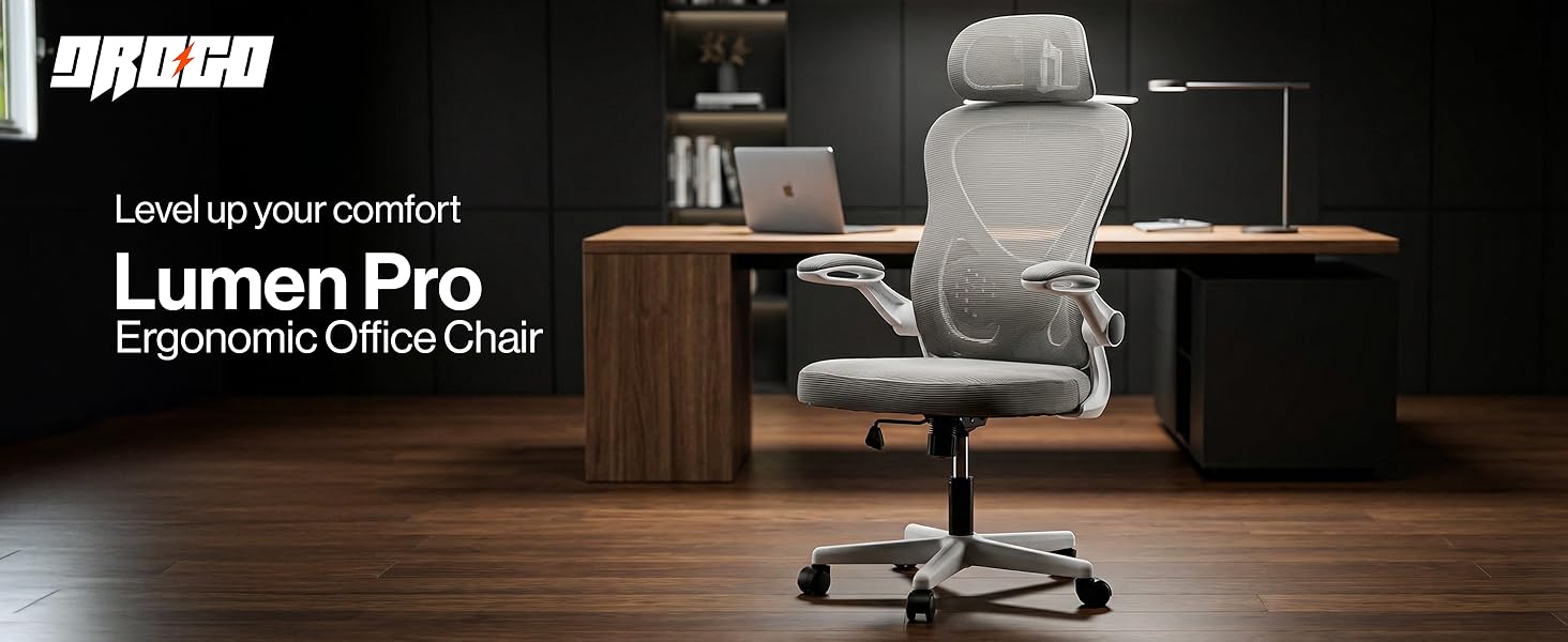 - Flip-up Armrests with Cushion and High Back Support: The Drogo ergonomic office chair features flip-up armrests with soft cushioning to support your elbows and allow easy tucking under desks. Combined with high back support, this office chair is ideal for chairs for office work, study spaces, or gaming setups.