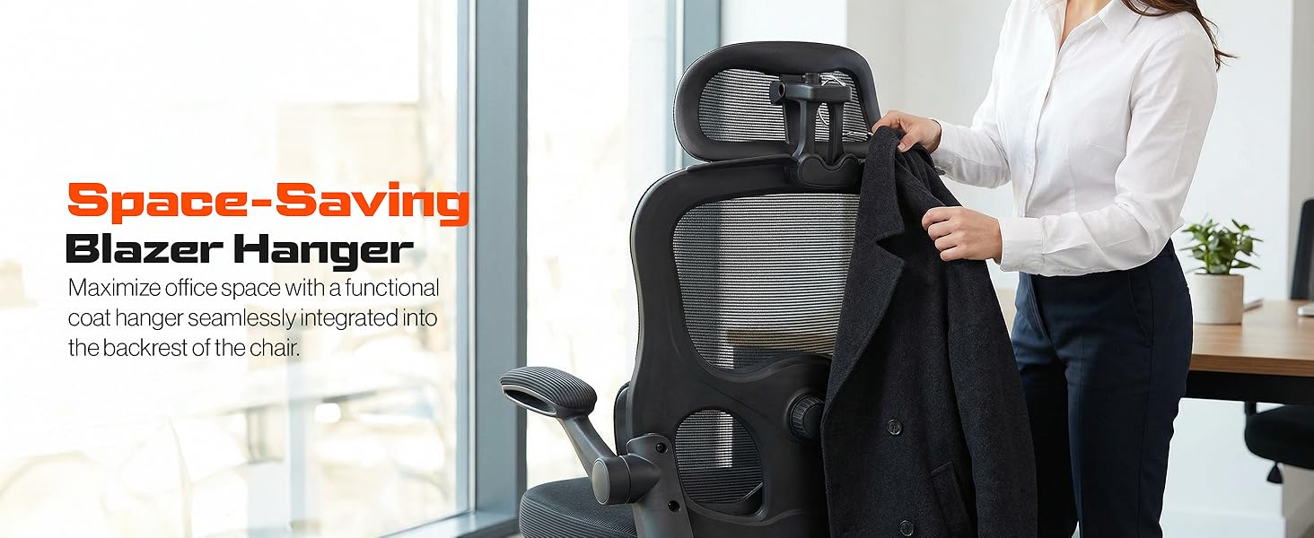 Space-Saving Blazer Hanger: Integrated coat hanger on the backrest helps save office chair space, perfect for keeping your blazer or jacket within easy reach.