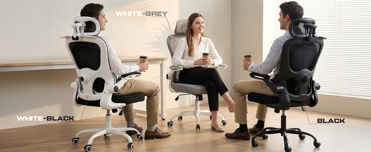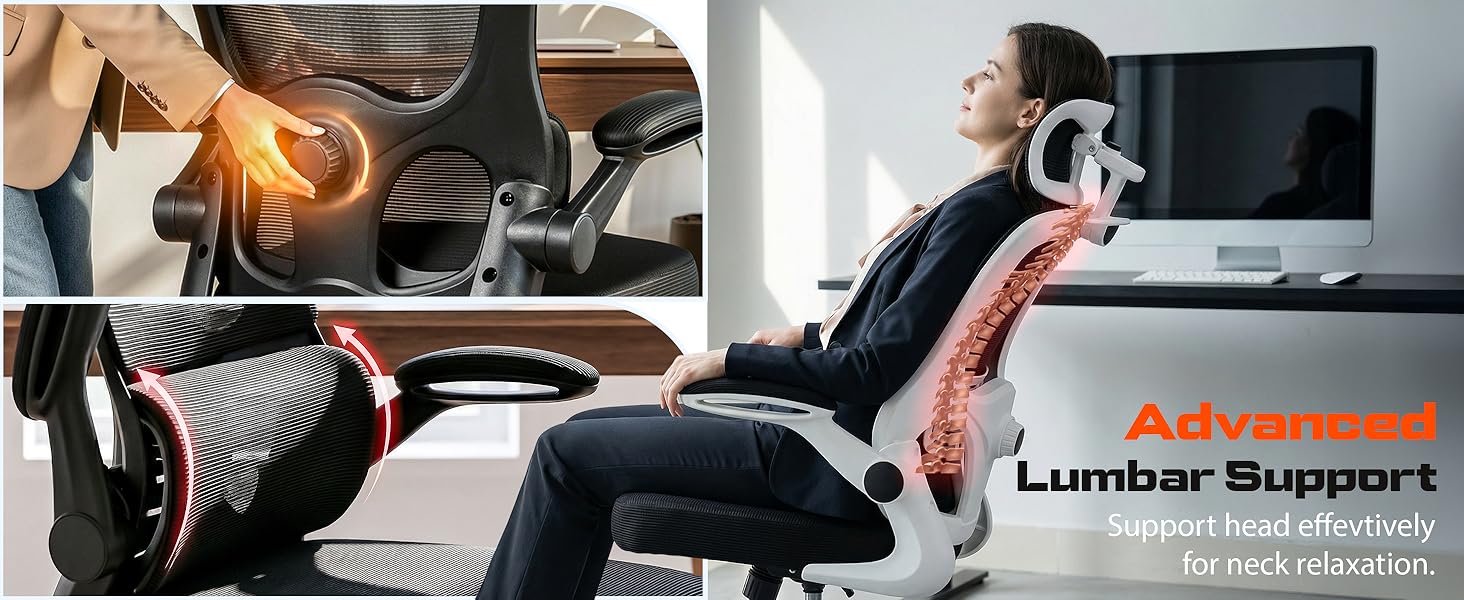 Ergonomic Office Chair Design: Provides optimal back and neck support for long hours of sitting, reducing strain and promoting comfort with its high-density mesh material and cushioned seating.
