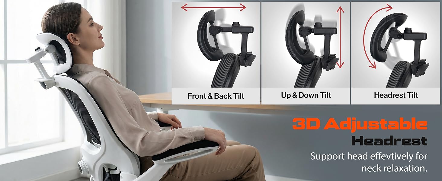 3D Adjustable Headrest: Provides head and neck support with customizable front/back tilt, up/down tilt, and headrest adjustments for maximum comfort.