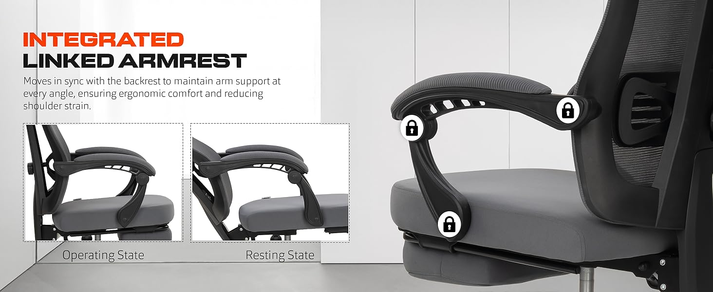 - INTUITIVE LINKAGE ARMRESTS WITH SOFT CUSHIONING: Integrated soft-padded linkage armrests move with your back as you recline, ensuring continuous support for your elbows and shoulders. An excellent choice when selecting chairs for office work that blend flexibility, comfort, and smart movement.