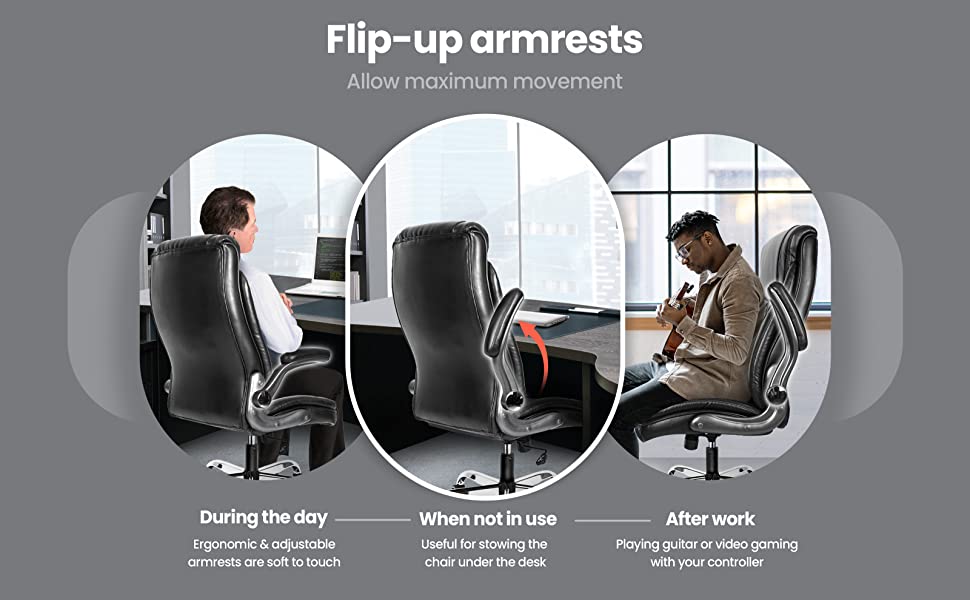 - ?Flip-Up Armrest Design?Flip-up arms offer an arm-less option without detaching anything, which gives comfort and support to your arms and shoulders. 90°rotation design which allows the chair can fit under the desk for space saving. Curved padded armrests add to the comfort, and strong construction lets you lean in how you like.