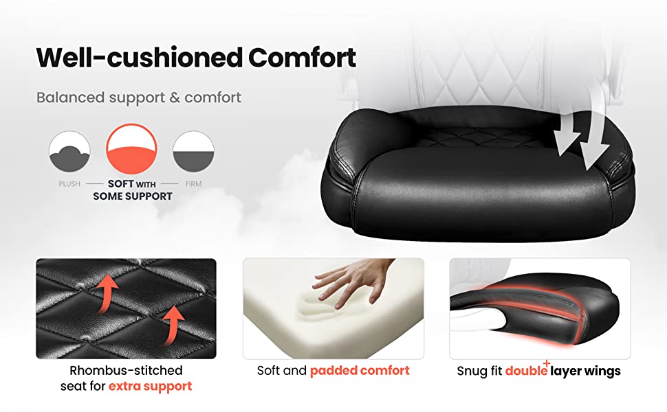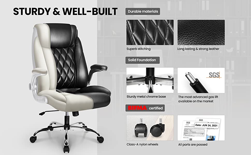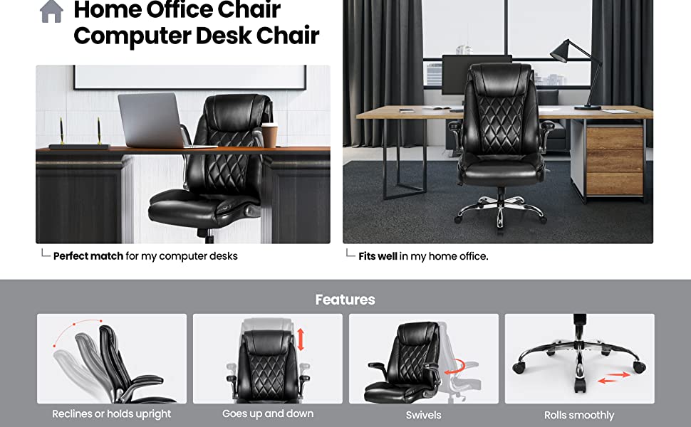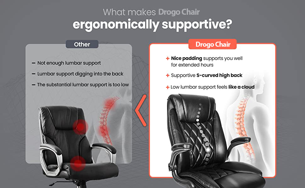 - ?Ergonomic Chair?High back office chair backrest provides you with lumbar support, and the leather cushion support offers more stable support for the neck so you won't feel back and shoulder pain after working long. Thickened padding armrests enhance elbow support, and relieve shoulder and upper back pressure High back office chair backrest provides you with lumbar support, and the leather cushion support offers more stable support for the neck so you won't feel back and shoulder pain after working long. Thickened padding armrests enhance elbow support, and relieve shoulder and upper back pressure.