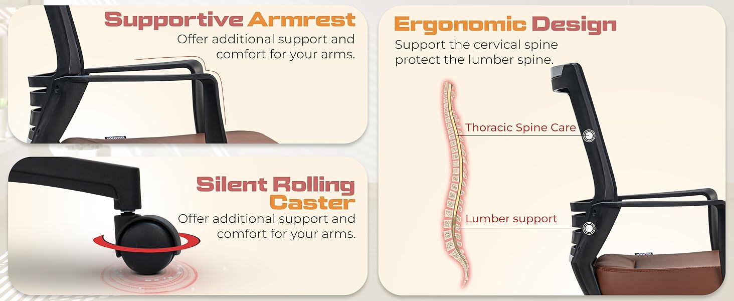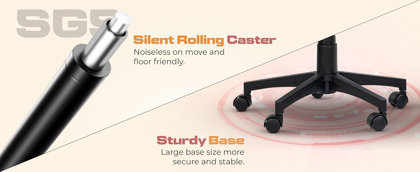 Silent Mobility with Durable Wheels: Move around your workspace silently and effortlessly with the high-quality PU caster wheels of our Lumina chair. These wheels ensure smooth mobility across different floor types without causing scratches or noise, enhancing your ability to multitask in a dynamic office environment.