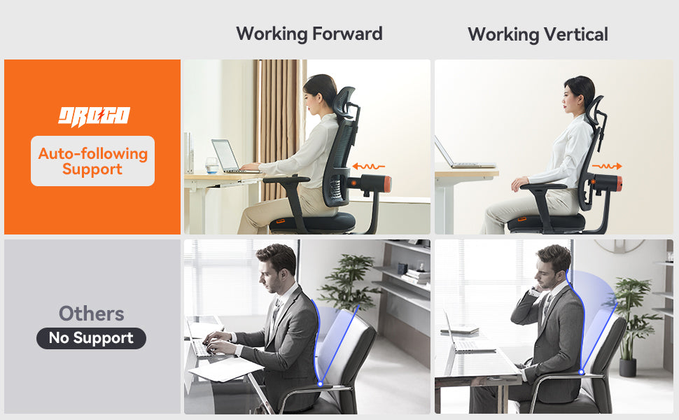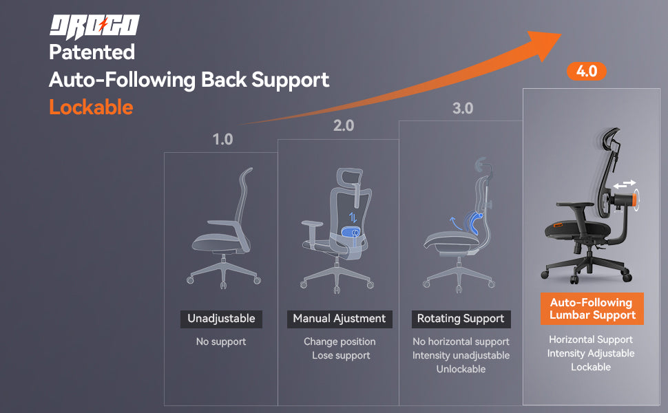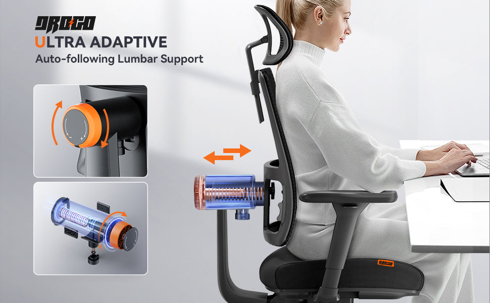 - Unique Adaptive Lumbar Supports: Drogo office chairs use innovative automatic lumbar tracking technology to automatically follow the movement of your lumbar spine, providing a strong support for your lower back throughout the day. Lumbar support strength can be adjusted according to your needs. It fits the natural curvature of your spine and helps relieve back pain caused by sitting for too long.