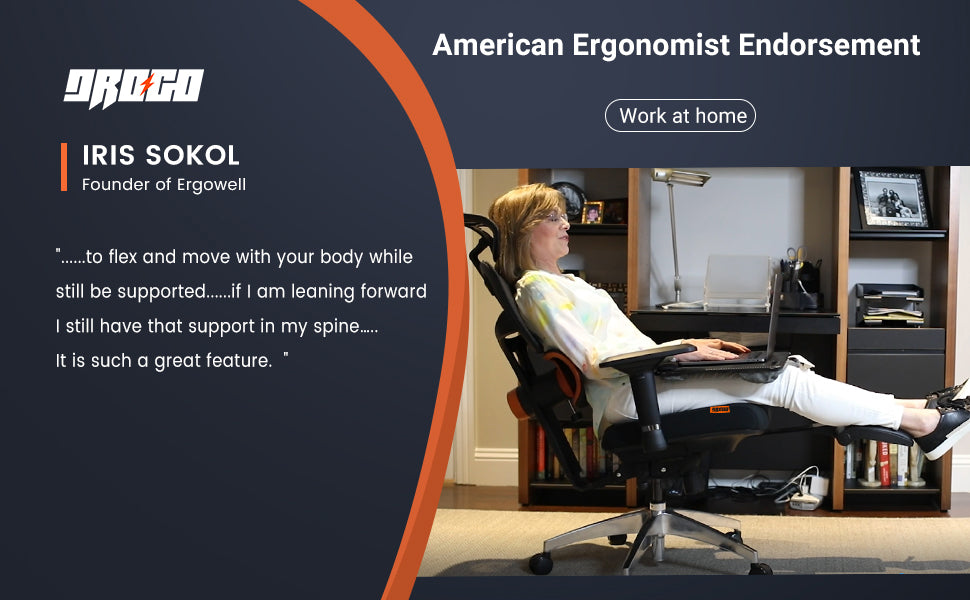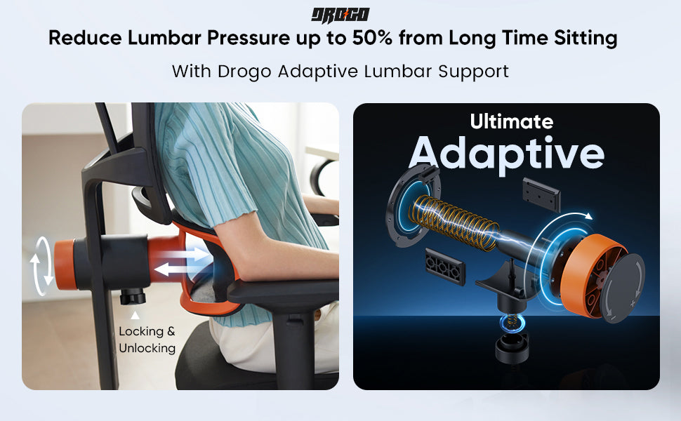 - Unique Adaptive Lumbar Supports: Drogo ergonomic office chair for work from home use innovative automatic lumbar tracking technology to automatically follow the movement of your lumbar spine, providing a strong support for your lower back throughout the day. Lumbar support strength can be adjusted according to your needs. It fits the natural curvature of your spine and helps relieve back pain caused by sitting for too long.