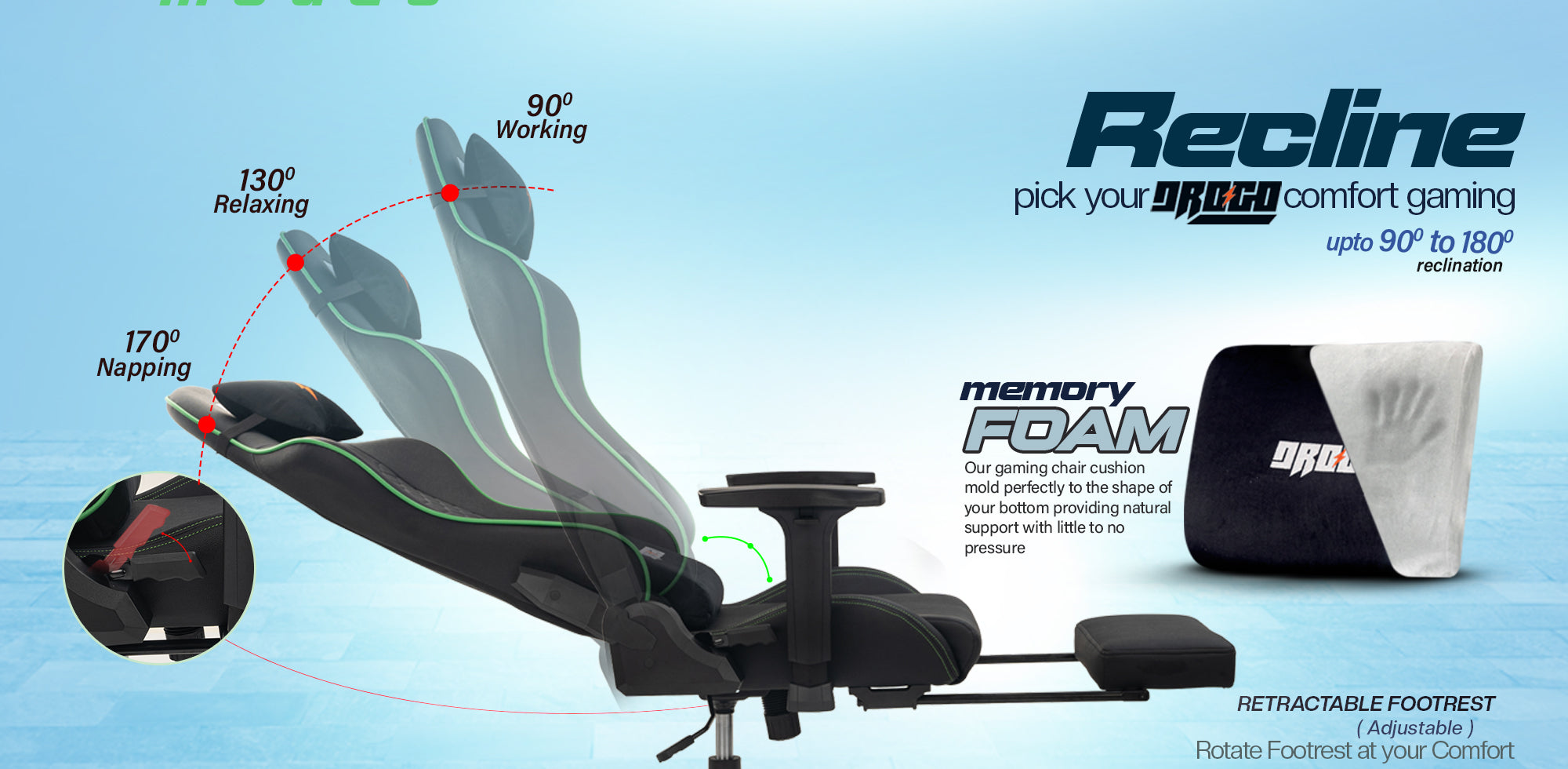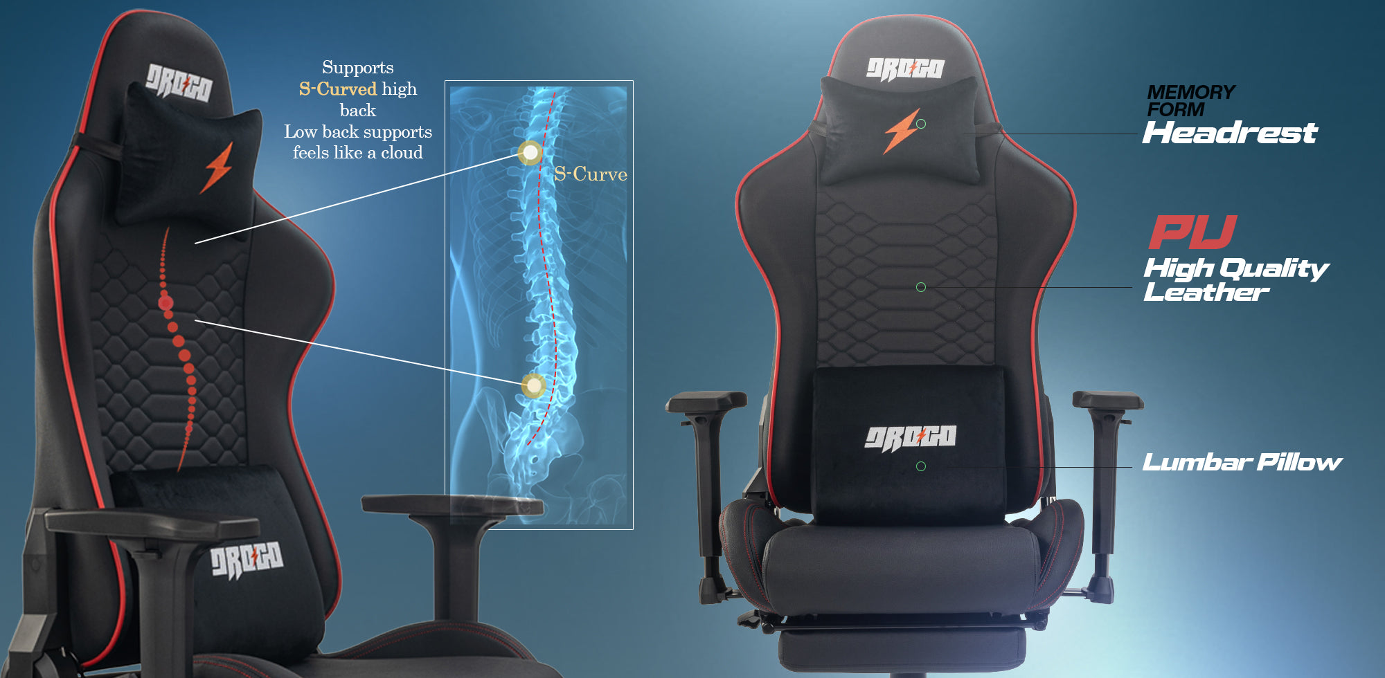 [Designed for Comfort] - Drogo gaming chair is made of high-quality materials The soft cushion is made of a high-density sponge, and the entire seat is wrapped in elastic PU leather. The back of the chair provides multi-point support, matched with soft memory Foam lumbar and headrests Pillow, which perfectly fits your spine. The retractable footrest can be adjusted at will.